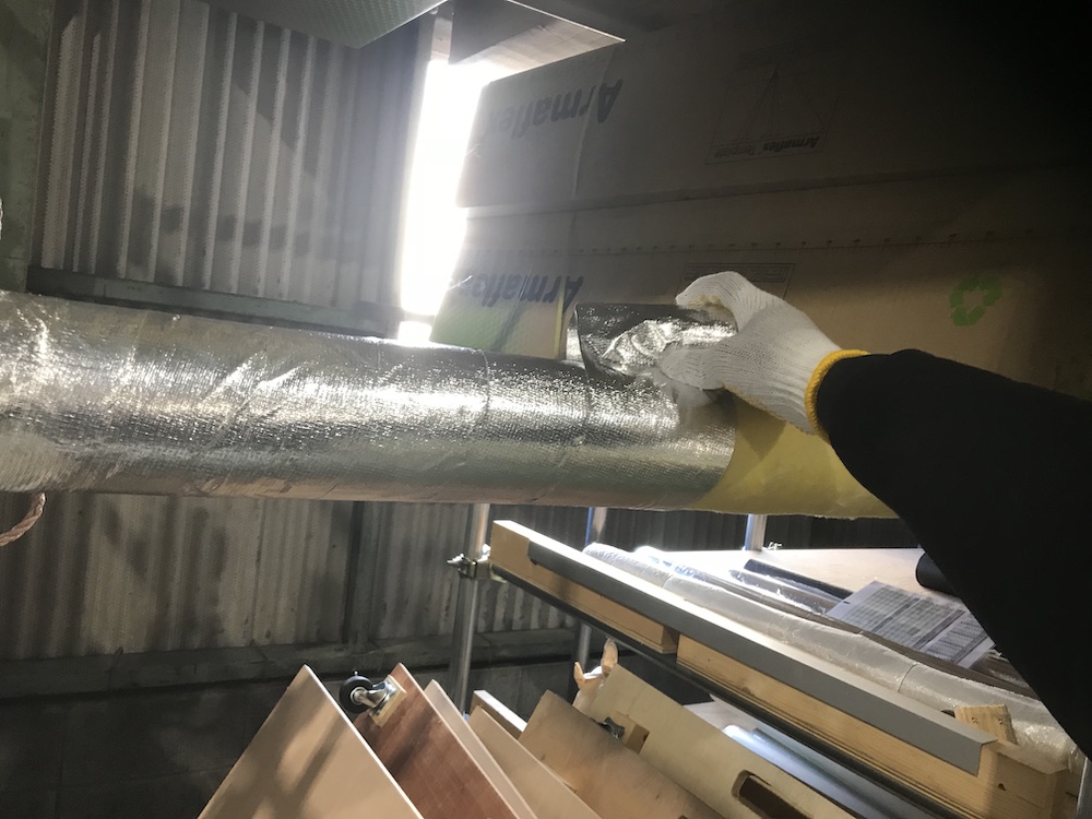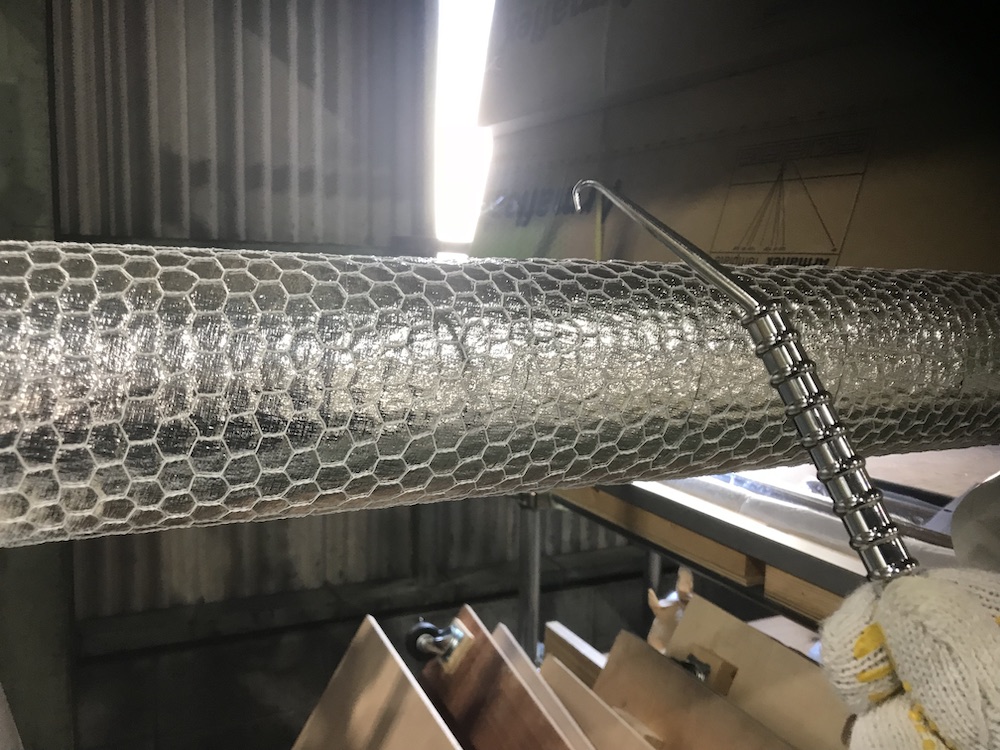 保温材・外装材の保護の為、金網を巻きます。ハッカーという道具でクルクル回して簡単取り付け。
