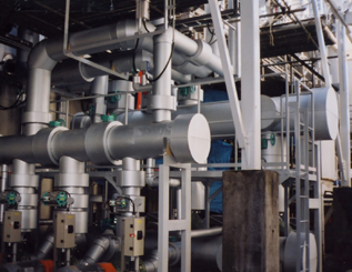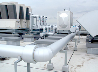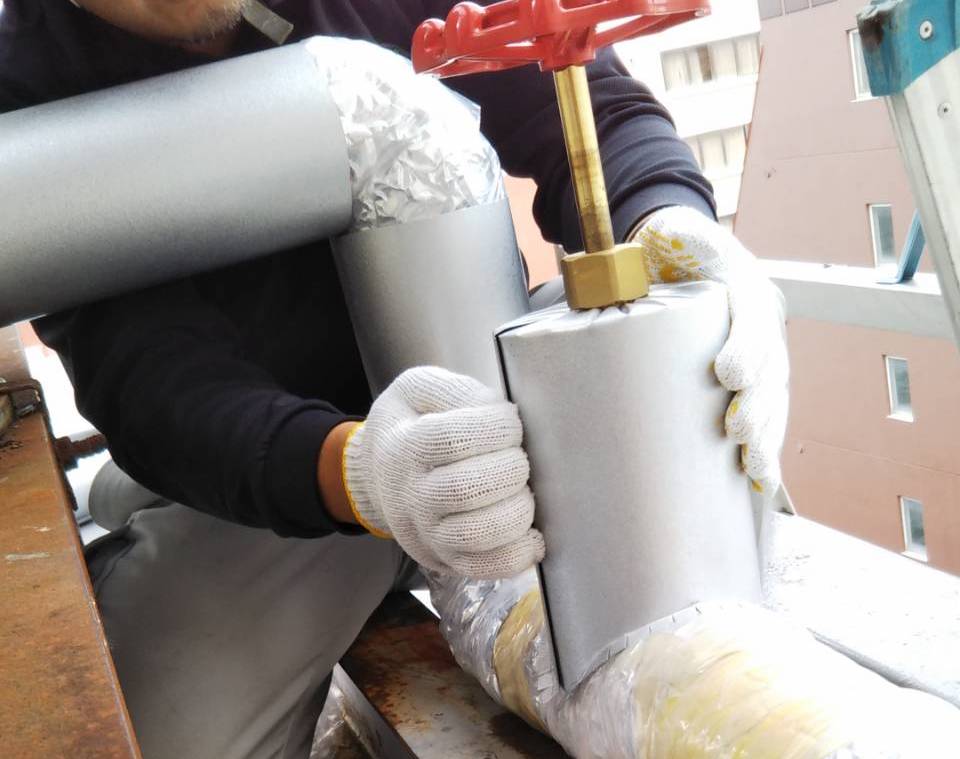 各種配管(水道管、蒸気配管、冷媒配管など)や空調用ダクトなどには、保温材や断熱材を取り付け、その効果を高めます。保温材・断熱材に用いられている素材は雨や風、紫外線や衝撃、鳥獣被害には弱い素材です。そのため、屋外などでは保温材・断熱材を守る補強が必要となり、その保温材・断熱材を保護し耐久性を高め、さらなる効果を見込むために、ステンレス鋼板、カラー鋼板、ガルバリウム鋼板、アルミ鋼板などで外装を施工することを板金工事といいます、板金材を取り付けることで、保温材を守りつつ耐候性を高めています。